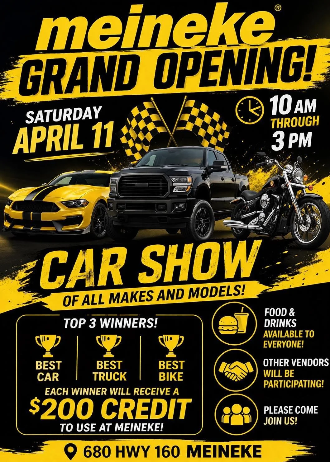 Meineke Grand Opening Car Show april 11th 2026 Saturday, April 11, 2026 10:00 AM 3:00 PM Google Calendar ICS