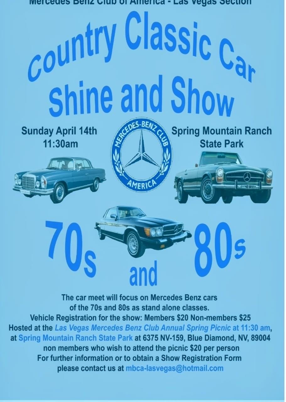 Back to All Events 70s and 80s Mercedes Country Classic Car Shine and Show Spring Mountain Ranch State Park - April 14th 2024 Sunday, April 14, 2024 11:30 AM 3:00 PM Spring Moutain Ranch State Park (map) Google Calendar ICS