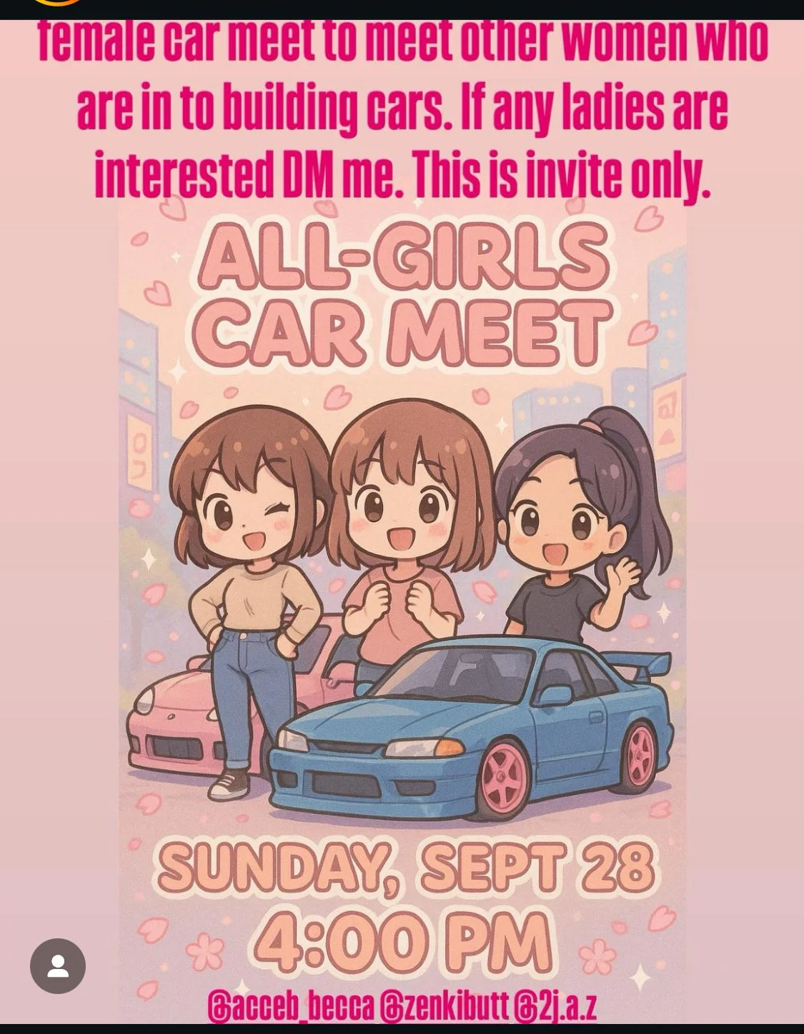 Back to All Events All Girls Car Meet sep 28th 2025 Sunday, September 28, 2025 4:00 PM 6:00 PM Google Calendar ICS