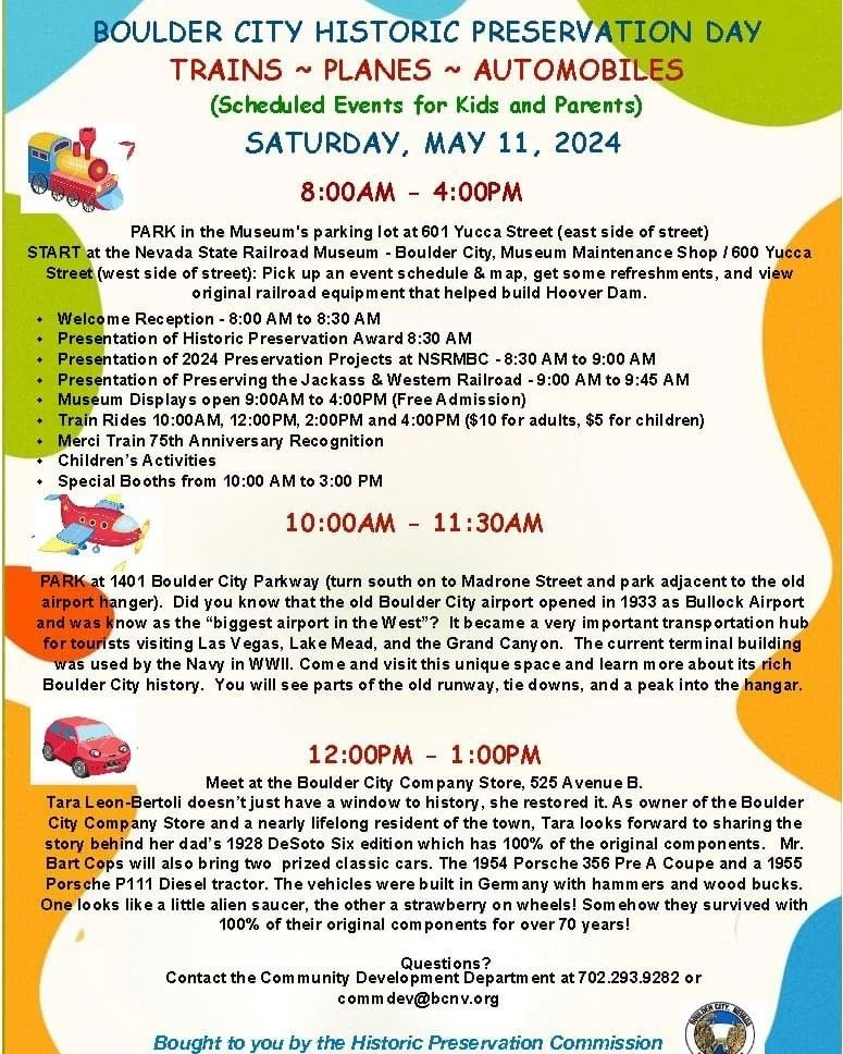 Boulder City Historic Preservation Day Trains Planes Automobiles - May 11th 2024 Saturday, May 11, 2024 8:00 AM 1:00 PM 601 Yucca Street Boulder City, NV, 89005 United States (map) Google Calendar ICS