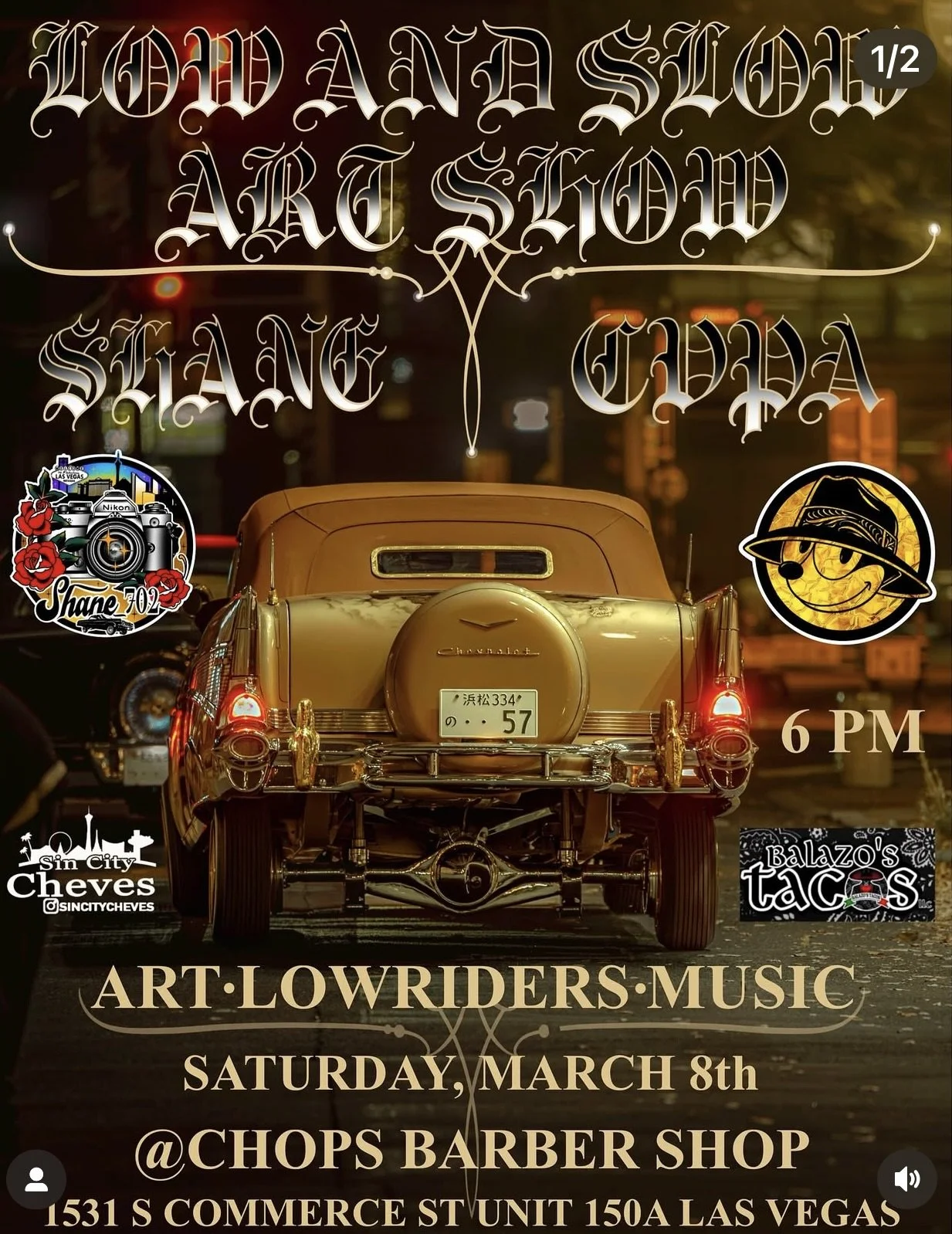 Lowrider Low and Slow Art Show at Chops Barber Shop Shane Orpa March 8th 2025 Saturday, March 8, 2025 6:00 PM 10:00 PM Google Calendar ICS
