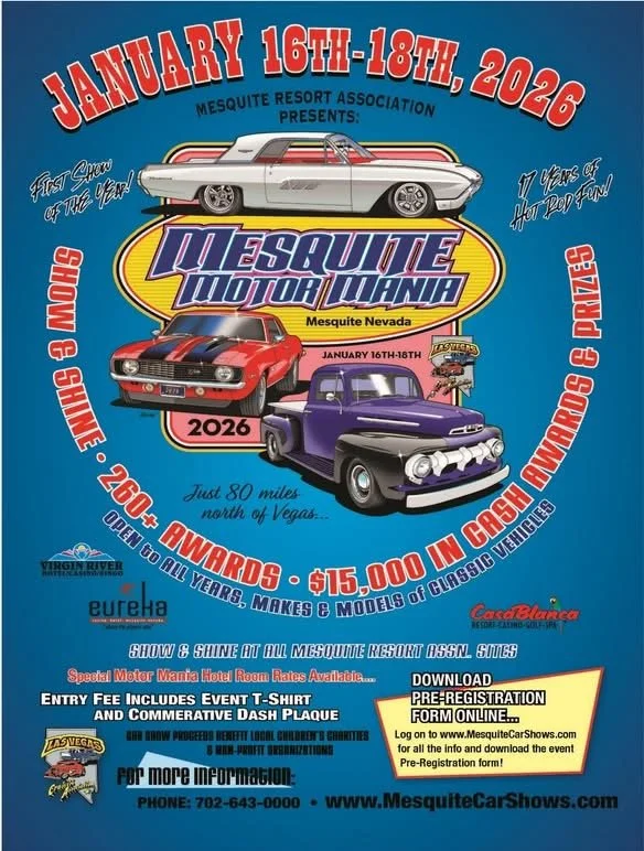Mesquite Motor Mania car show jan 16th 18th 2026 Friday, January 16, 2026 7:00 AM Sunday, January 18, 2026 5:00 PM Google Calendar ICS