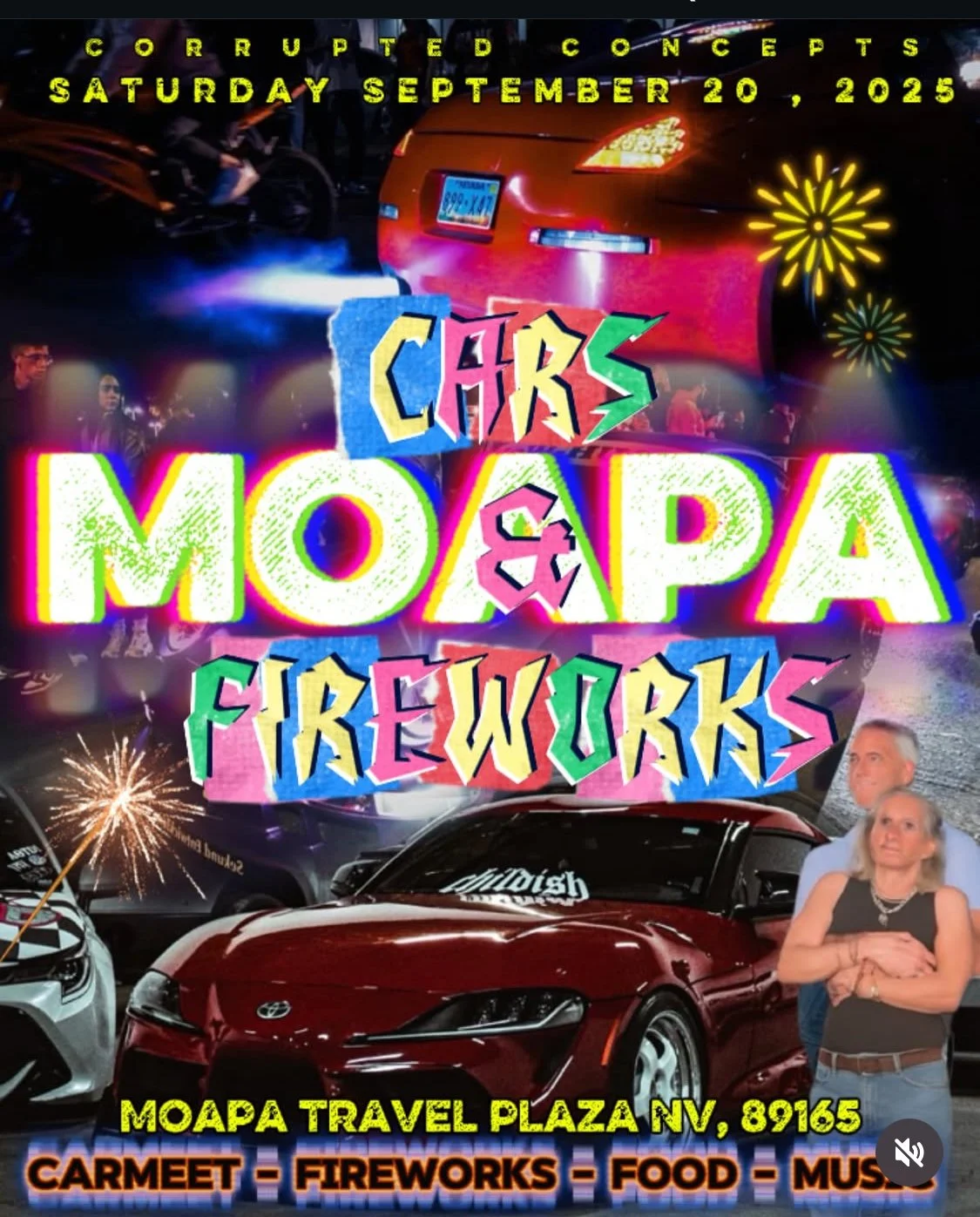 Moapa Cars and Fireworks Corrupted Concepts sep 20th 2025 Saturday, September 20, 2025 7:00 PM 10:00 PM Google Calendar ICS