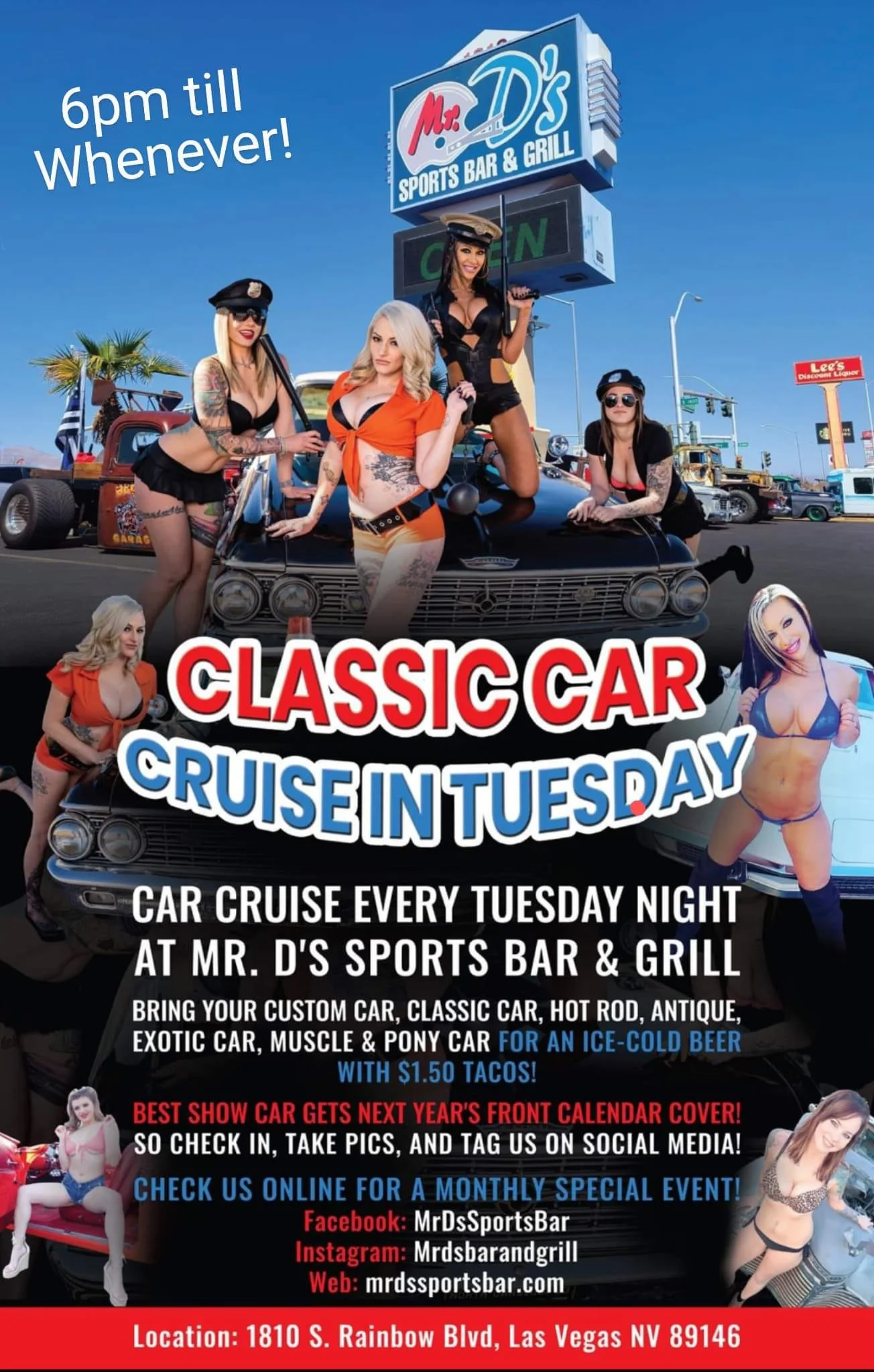 Back to All Events Mr Ds Classic Car Cruise in Every Tuesday - April 23th 2024 Tuesday, April 23, 2024 6:00 PM 9:00 PM 1810 South Rainbow Boulevard Las Vegas, NV, 89146 United States (map) Google Calendar ICS