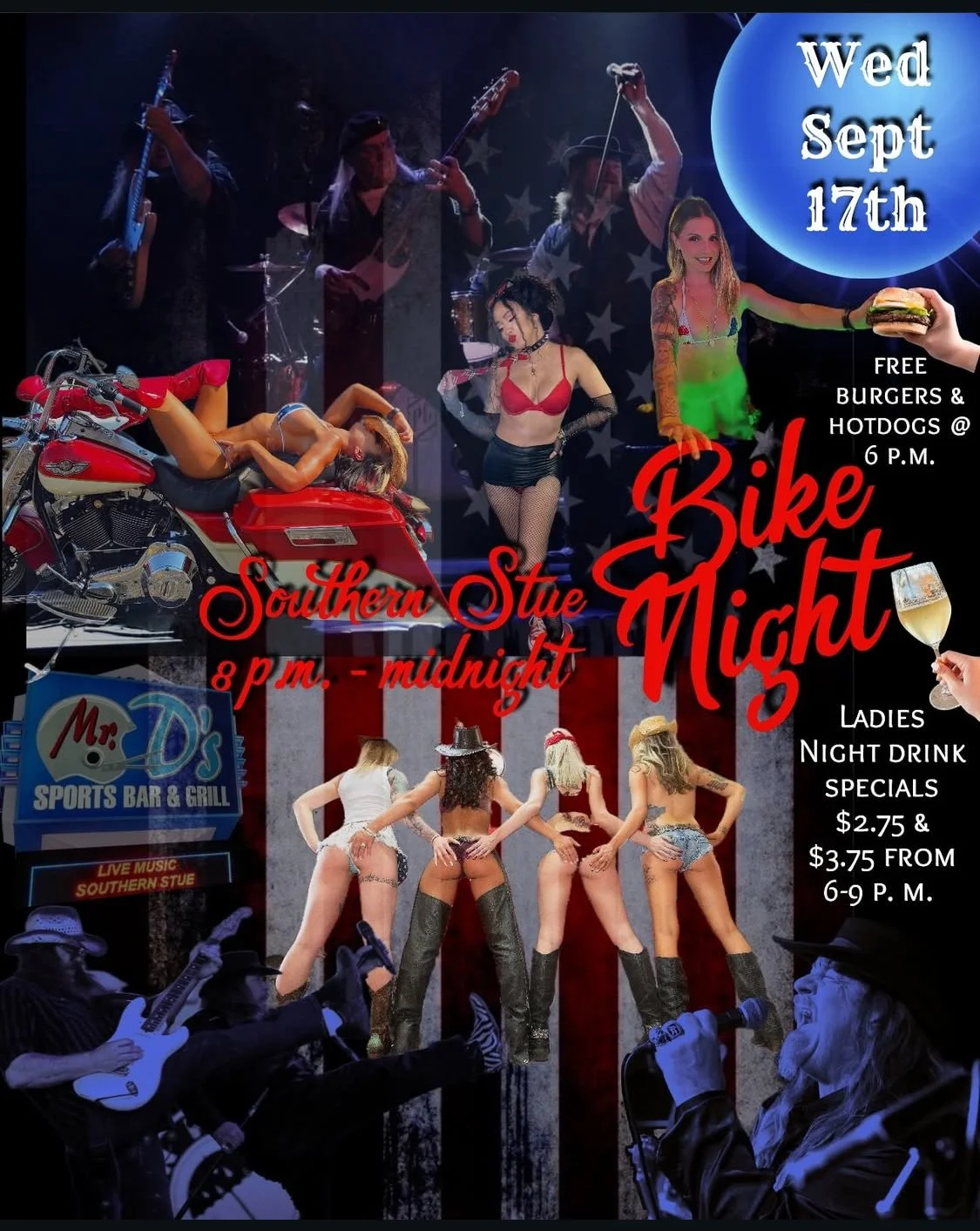 Mr Ds Sports Bar and Grill Southern Stue Bike Night sep 17th 2025 Wednesday, September 17, 2025 6:00 PM 9:00 PM Google Calendar ICS