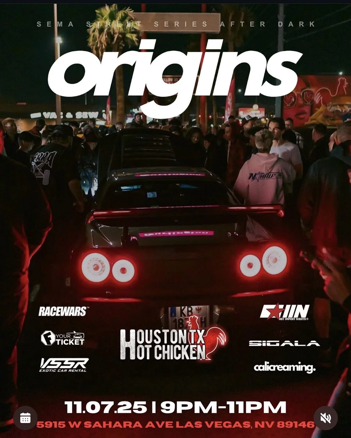 Origins SEMA Houston Tx Hot Chicken Racewars VSSR Sigala Calicreaming Street Series After Dark nov 7th 2025 Friday, November 7, 2025 9:00 PM 11:00 PM Google Calendar ICS