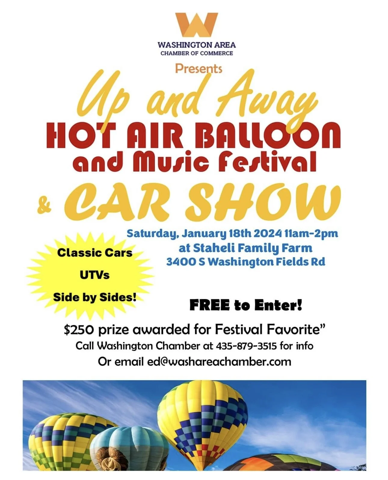 Up and Away Hot Air Balloon Music Festival Car Show Washington Area Chamber of Commerce January 18th 2024 Saturday, January 18, 2025 11:00 AM 2:00 PM Google Calendar ICS